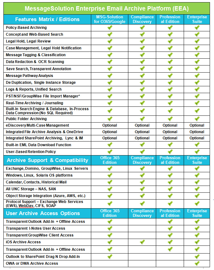 MessageSolution provides multiple editions of Enterprise Email Archive, each stocked with a variety of industry-leading features and functions. For more information on features and functionality, please view the Enterprise Email Archive Product Version Chart